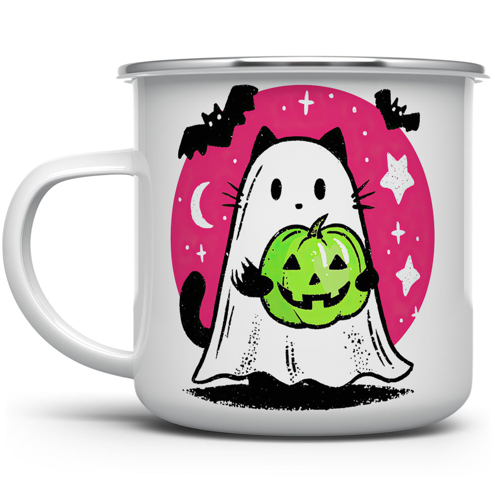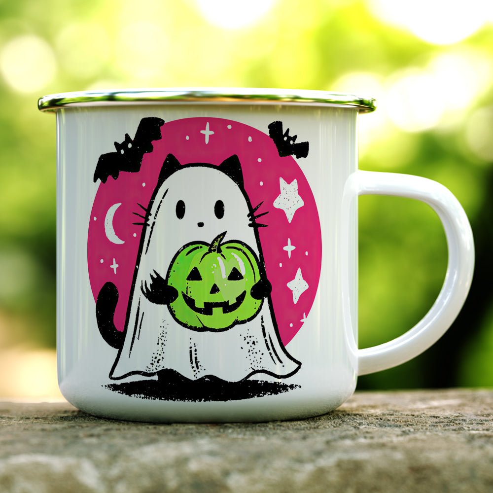 Add a playful dose of spooky charm to your drinkware with the Ghost Kitty and Pumpkin Camp Mug. This design features a sweet ghost cat holding a pumpkin, blending Halloween whimsy with retro style. Lightweight yet durable, this enamel camp mug is perfect for sipping coffee, tea, or cocoa at the pumpkin patch, cozy nights by the fire, or while reading your favorite spooky tale. A delightful Halloween gift for cat lovers and retro collectors alike.
