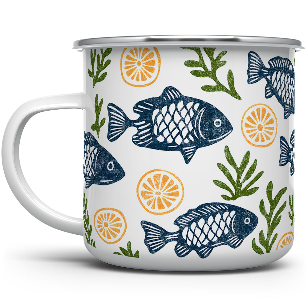 Our Mediterranean Fish Enamel Camp Mug features a cheerful repeating pattern of fish, bright citrus slices, and flowing seaweed botanicals. Lightweight and durable, this enamel camp mug is perfect for beach mornings, camping trips, boat outings, or enjoying coffee at a seaside cabin.