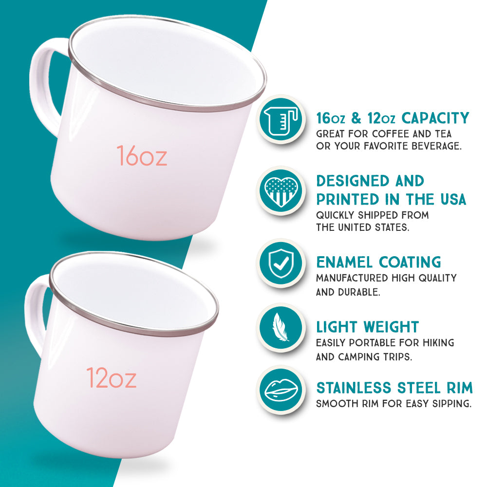 • 12oz or 16oz enamel mug with stainless steel rim