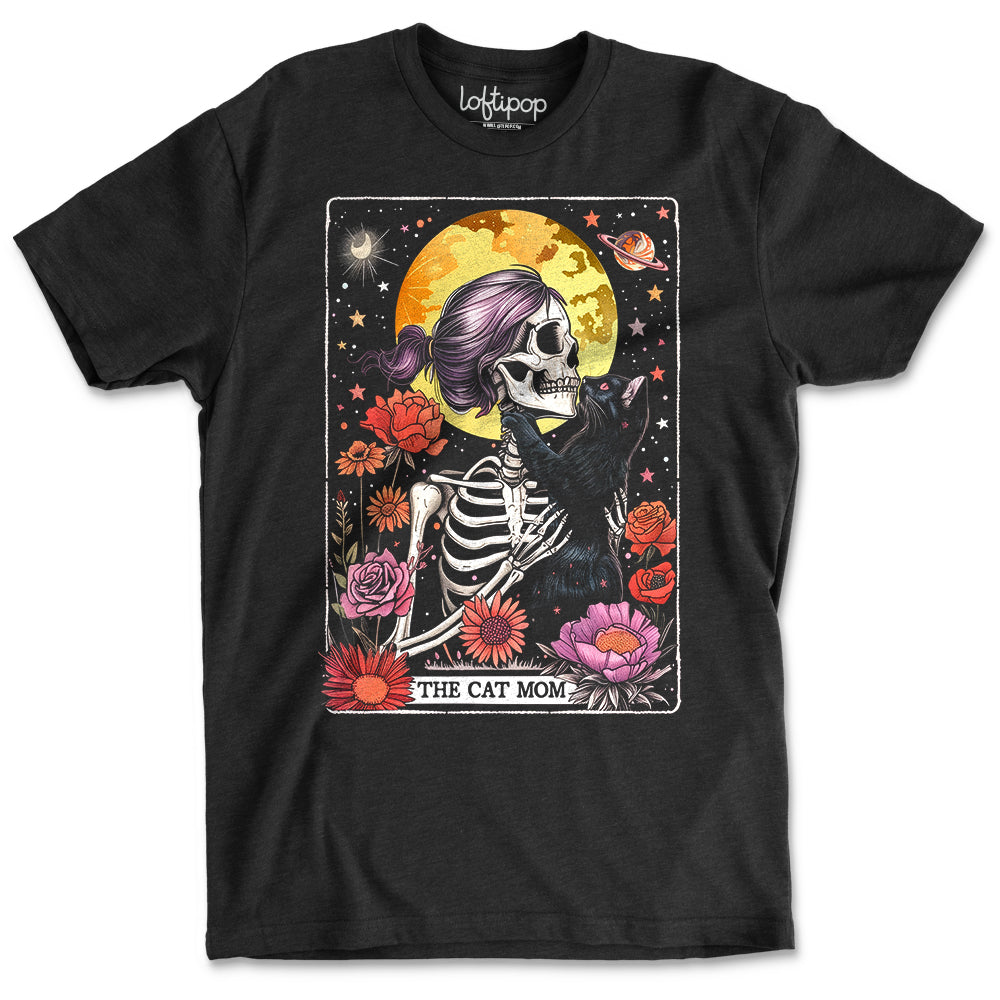 Our The Cat Mom Tarot T-Shirt features a stunning tarot-inspired illustration of a skeleton lovingly embracing a black cat beneath a glowing moon, surrounded by florals and celestial details. Labeled “The Cat Mom,” this design blends devotion, mysticism, and a little dark magic into one powerful statement piece.