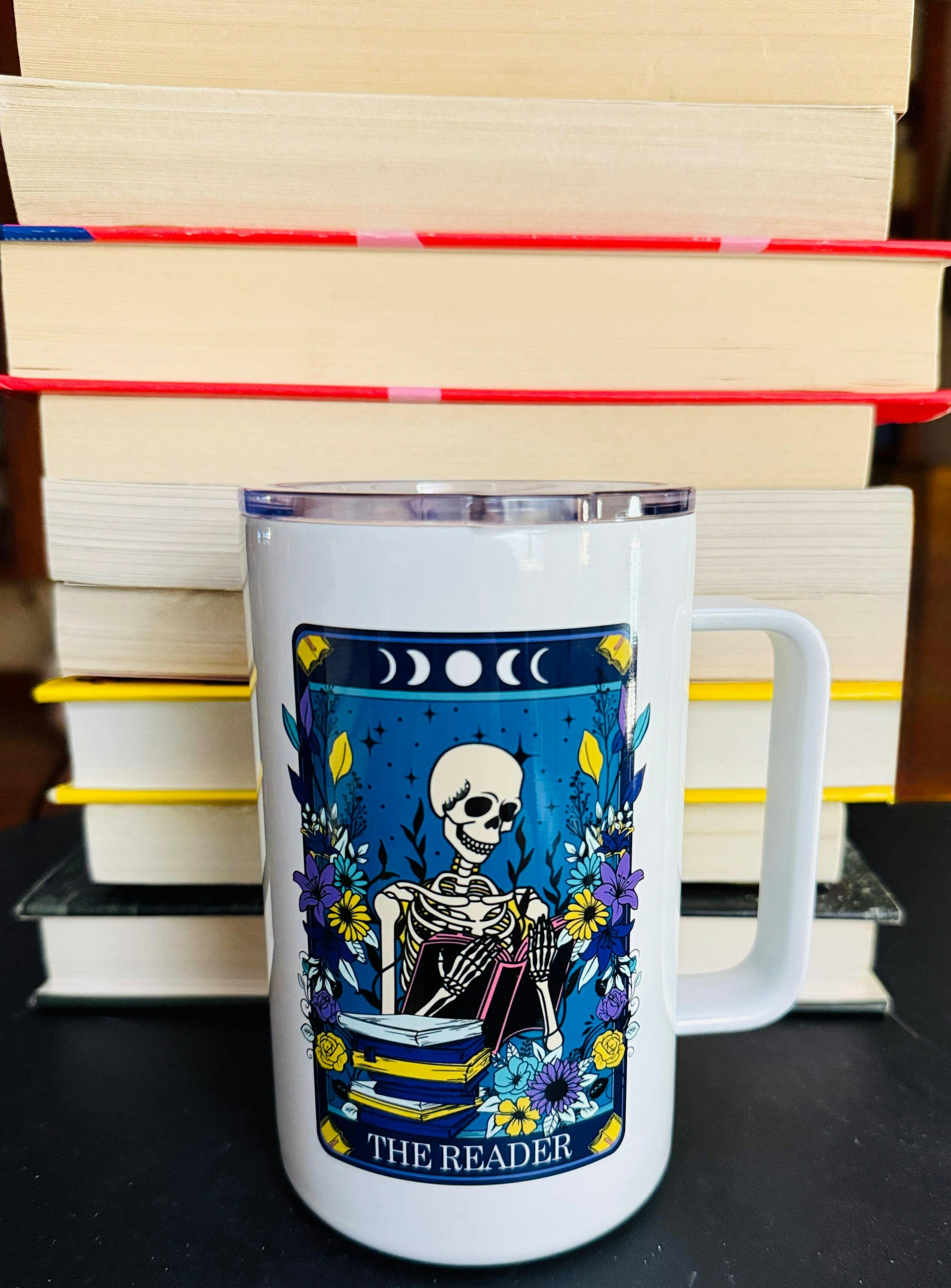 Unleash your inner book lover with The Reader Tarot Card Insulated Travel Mug. This charming mug is perfect for bibliophiles on-the-go, holding either 12 or 18 ounces of your favorite beverage. Keep your drink at the perfect temperature while showing off your love of reading with this unique tarot card design.