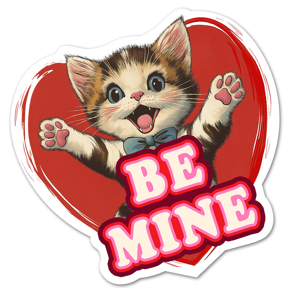 Say it with the cutest kitten ever — the Be Mine Cat Sticker features an adorable wide-eyed cat in front of a big red heart, with bold retro lettering that reads “BE MINE.” Sweet, playful, and full of Valentine’s charm, this sticker is perfect for people who love cute cat gifts, romantic vibes, and fun retro graphics.