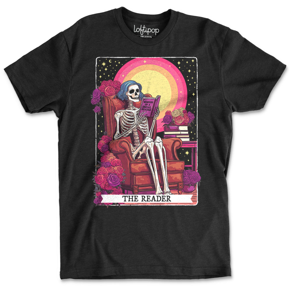 Our The Reader Tarot T-Shirt features a striking tarot-inspired illustration of a skeleton seated in a cozy chair, absorbed in a book, surrounded by roses, stacked novels, and celestial details. Labeled “The Reader,” this design blends bookish devotion with mystical, gothic charm.