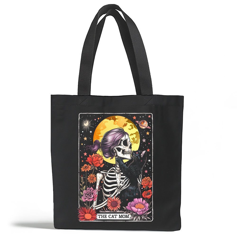 Our The Cat Mom Tarot Tote Bag features a striking tarot-inspired illustration of a skeleton lovingly holding a cat, surrounded by florals, celestial details, and a glowing moon. It blends gothic romance, mystical symbolism, and deep cat devotion—perfect for readers, tarot lovers, and proud cat parents.