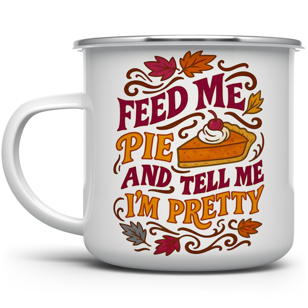Add a slice of humor to your holiday season with the Funny Fall Thanksgiving Camp Mug. Featuring the cheeky quote “Feed Me Pie and Tell Me I’m Pretty,” this lightweight enamel mug is perfect for cozy fall mornings, Thanksgiving gatherings, or post-feast coffee by the fire. With its retro-inspired design and durable build, it’s a fun and festive gift for pie lovers, homebodies, and anyone who enjoys a little sass with their pumpkin spice latte.